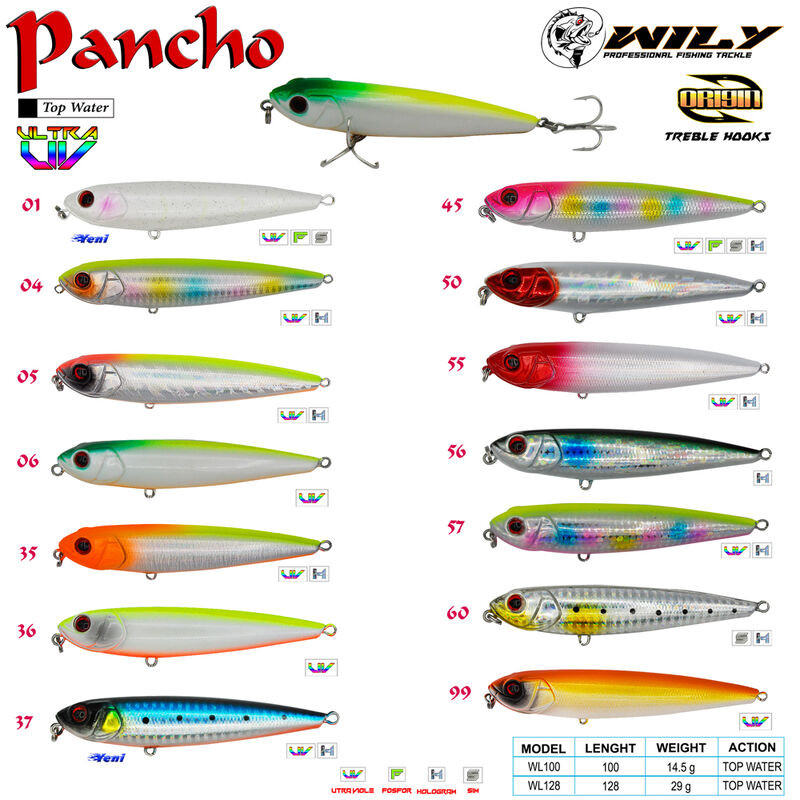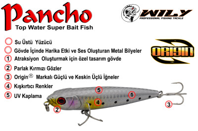 Suni Balık Yemleri ürünleri içerisinde Wily markalı ürünler oldukça tercih edilmektedir. Maket Balık ürünleri içerisinde Wily Pancho Maket Balık, özellikle Levrek, lüfer, çinekop, kofana gibi dişli balık avında çok iyi sonuç verir.